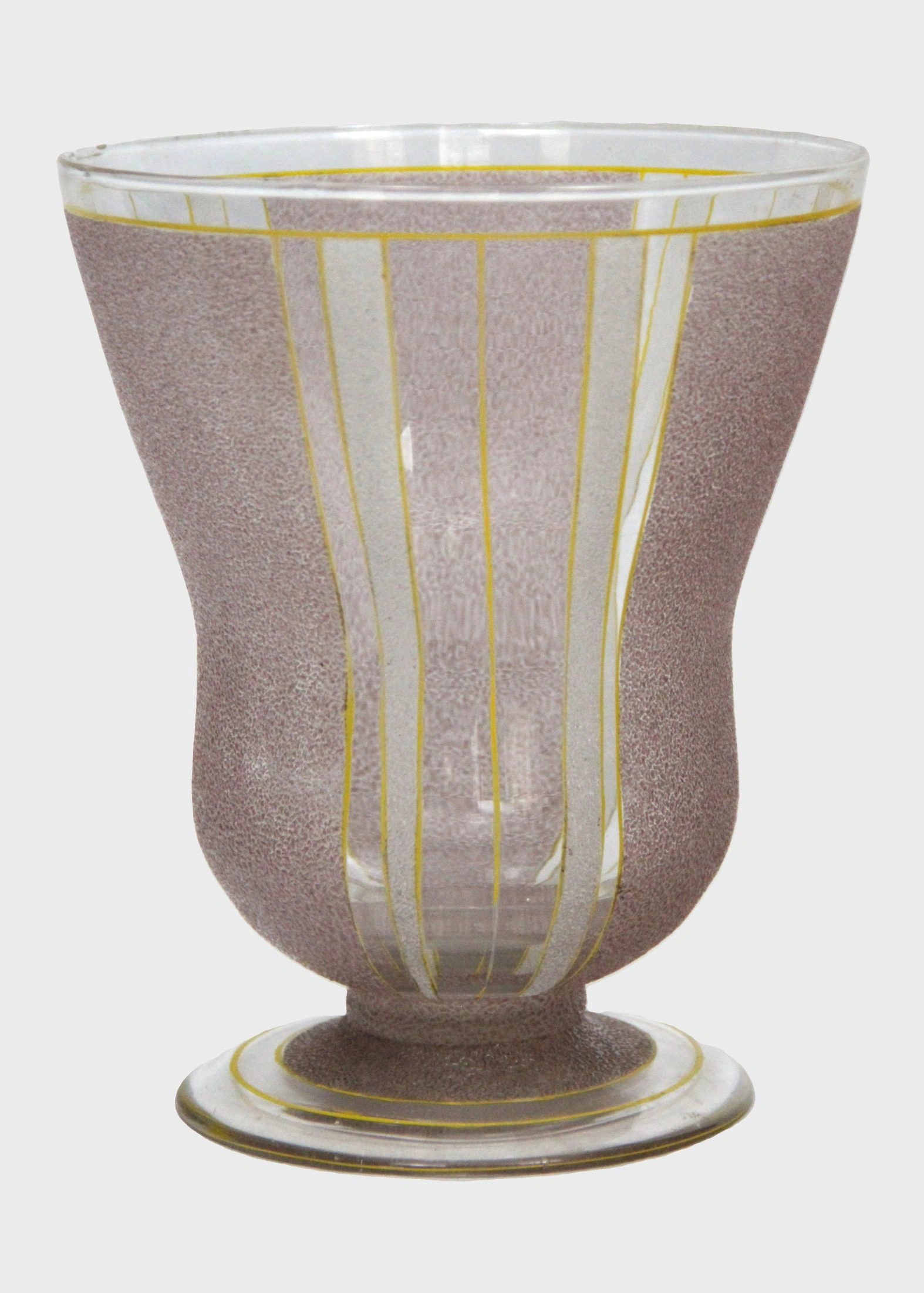Glazen vaas met paarse mattering en afgelijnd met gele biezen.