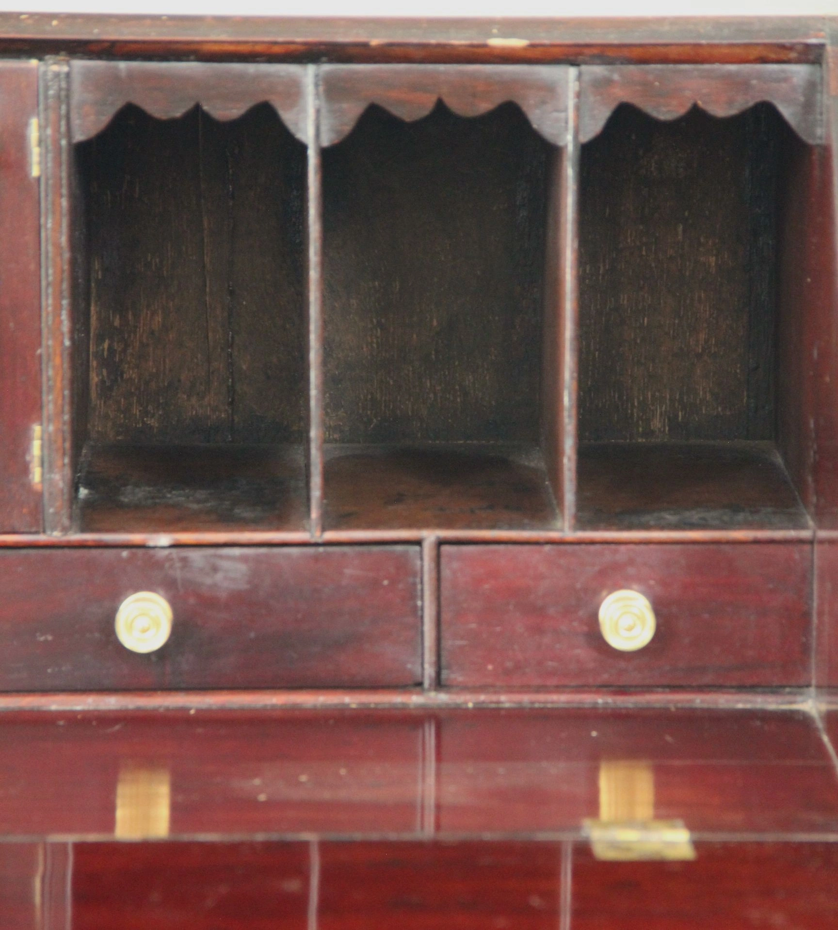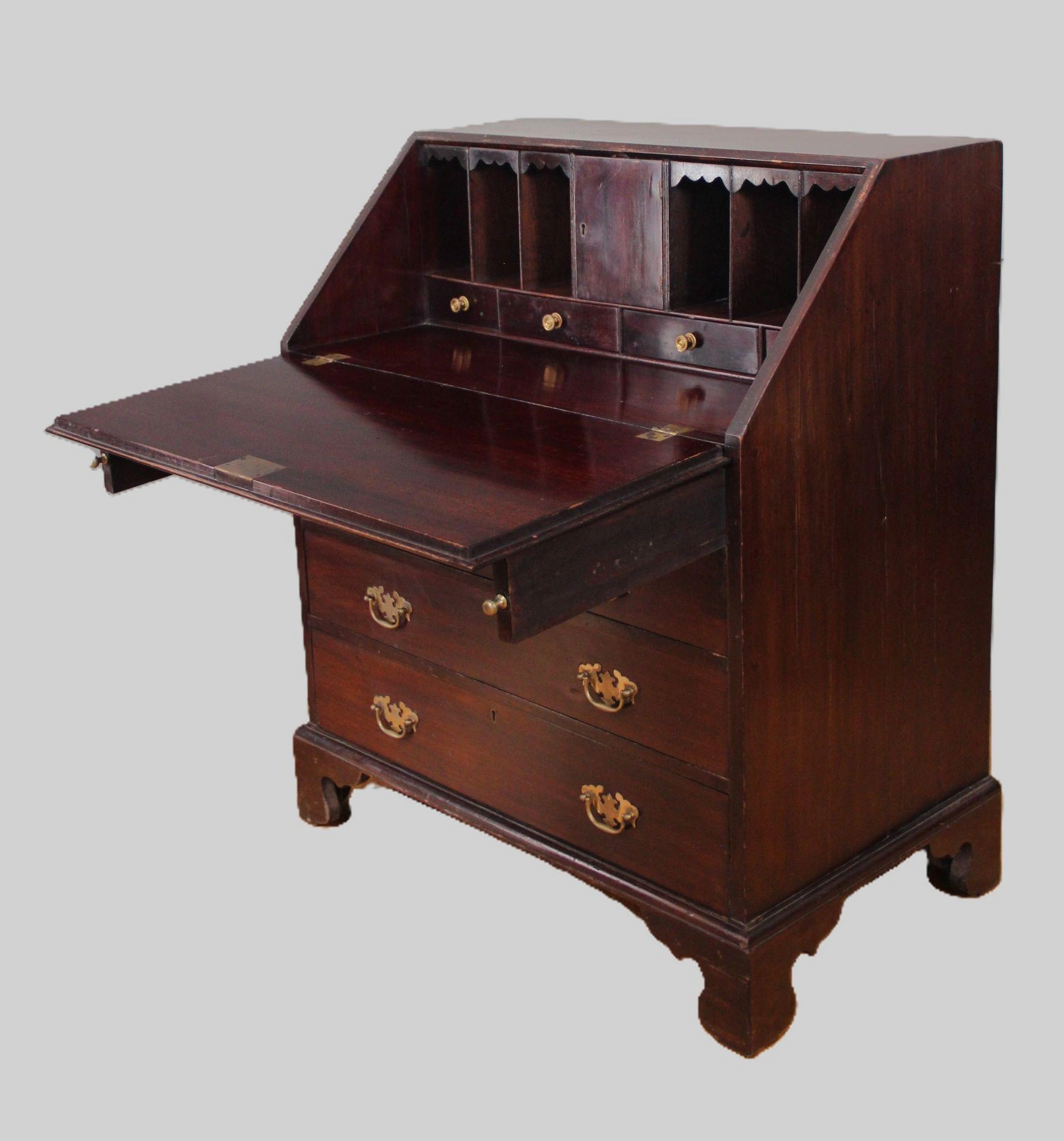 Klassiek Engels bureau met neerklapbaar schrijfblad en laden onderaan.
