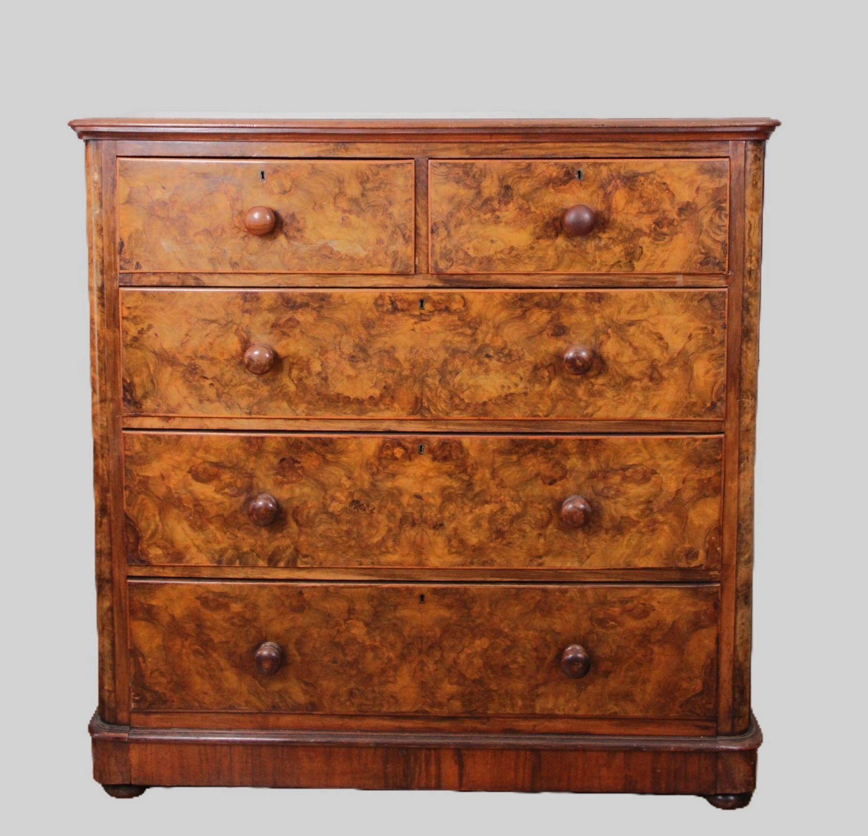 Ladefronten afgewerkt met Notenwortelhout in open boek verlijmd. Oorspronkelijke trekkers in notenhout